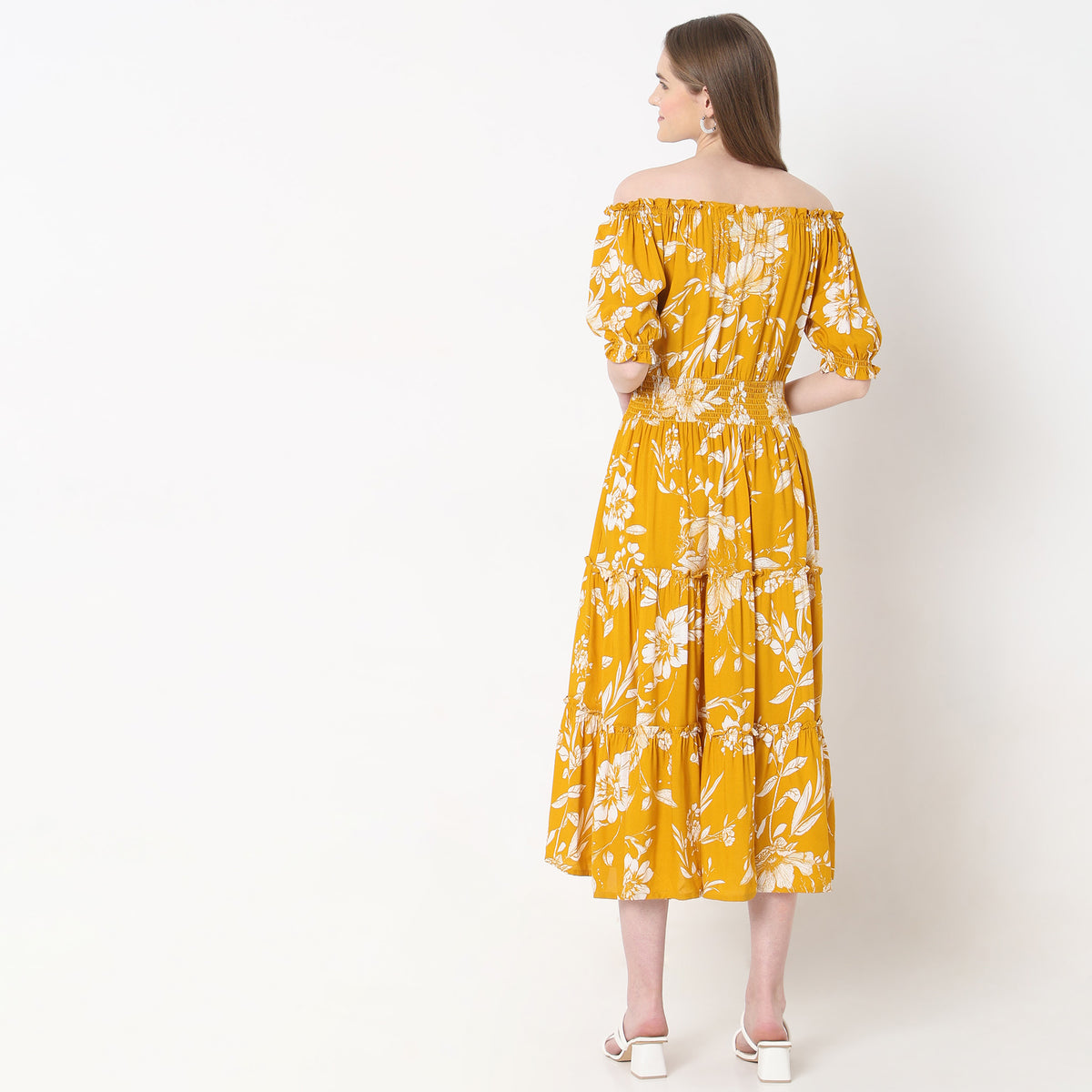 This printed pattern dress has a offshoulder and short sleeve. Made from viscose, it is soft and comfortable to wear.