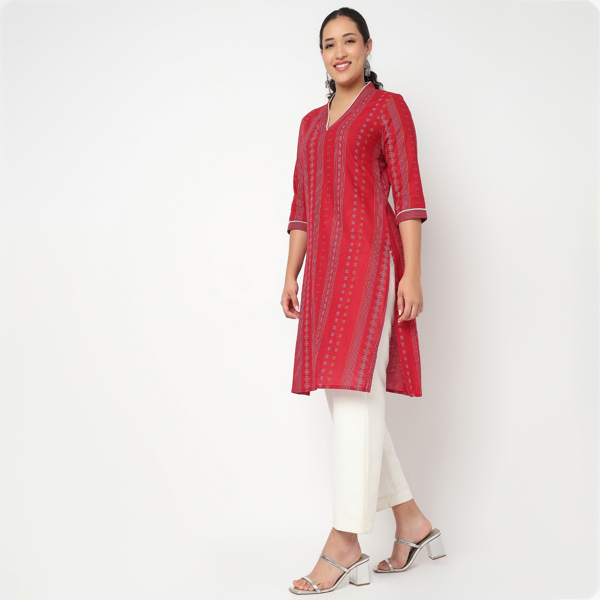 Elevate your wardrobe with the V Neck With Gusset Long Kurta, designed for women who appreciate comfort and style. Crafted from breathable cotton, this knee-length kurta combines a modern printed pattern with timeless elements.