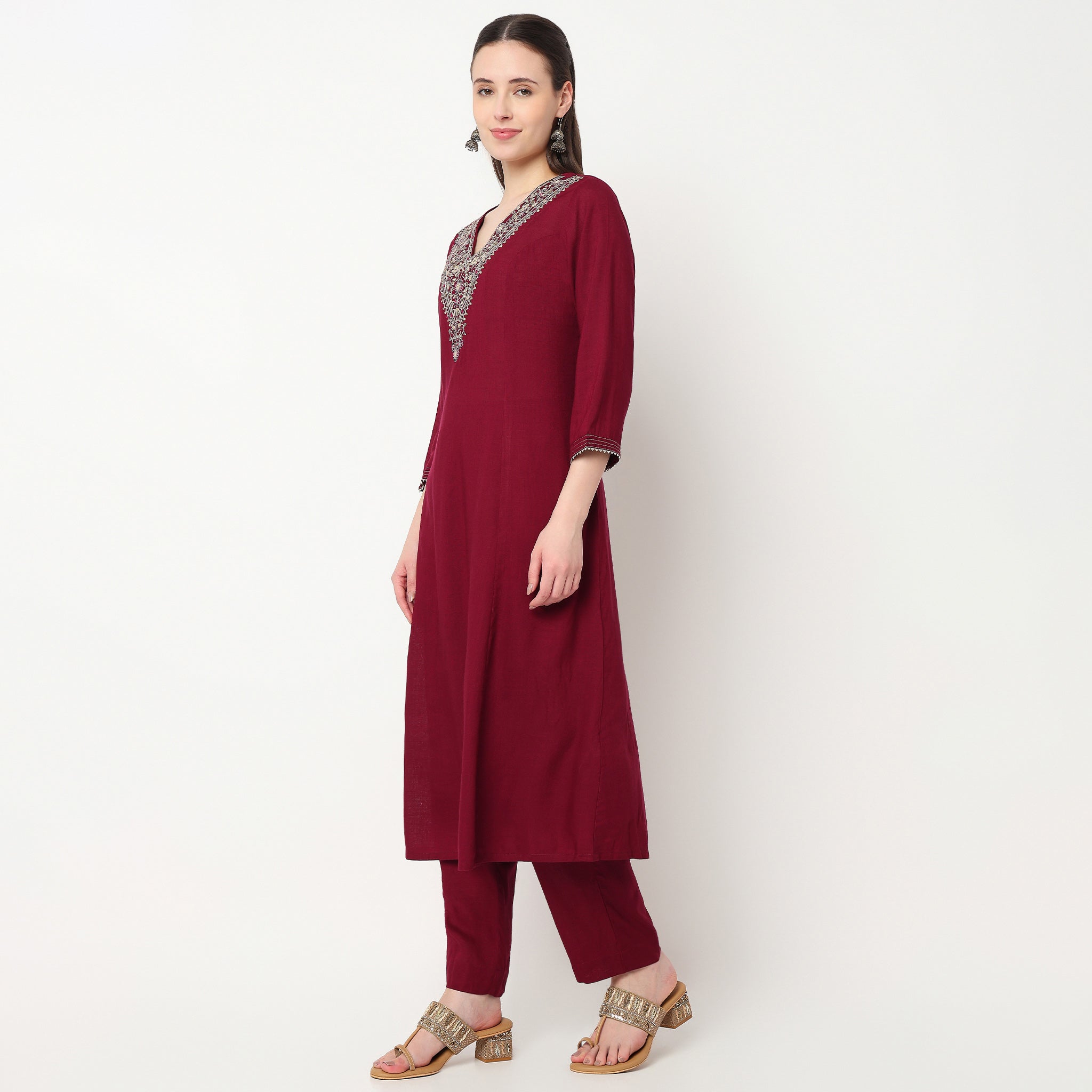 Experience the perfect blend of elegance and comfort with our Embroidered V-Neck Kurta Pant Set. Crafted from 100% Rayon, this set offers a soft, breathable feel that ensures you stay comfortable all day long. The intricate embroidery adds a touch of sophistication, making it ideal for both casual outings and festive occasions.