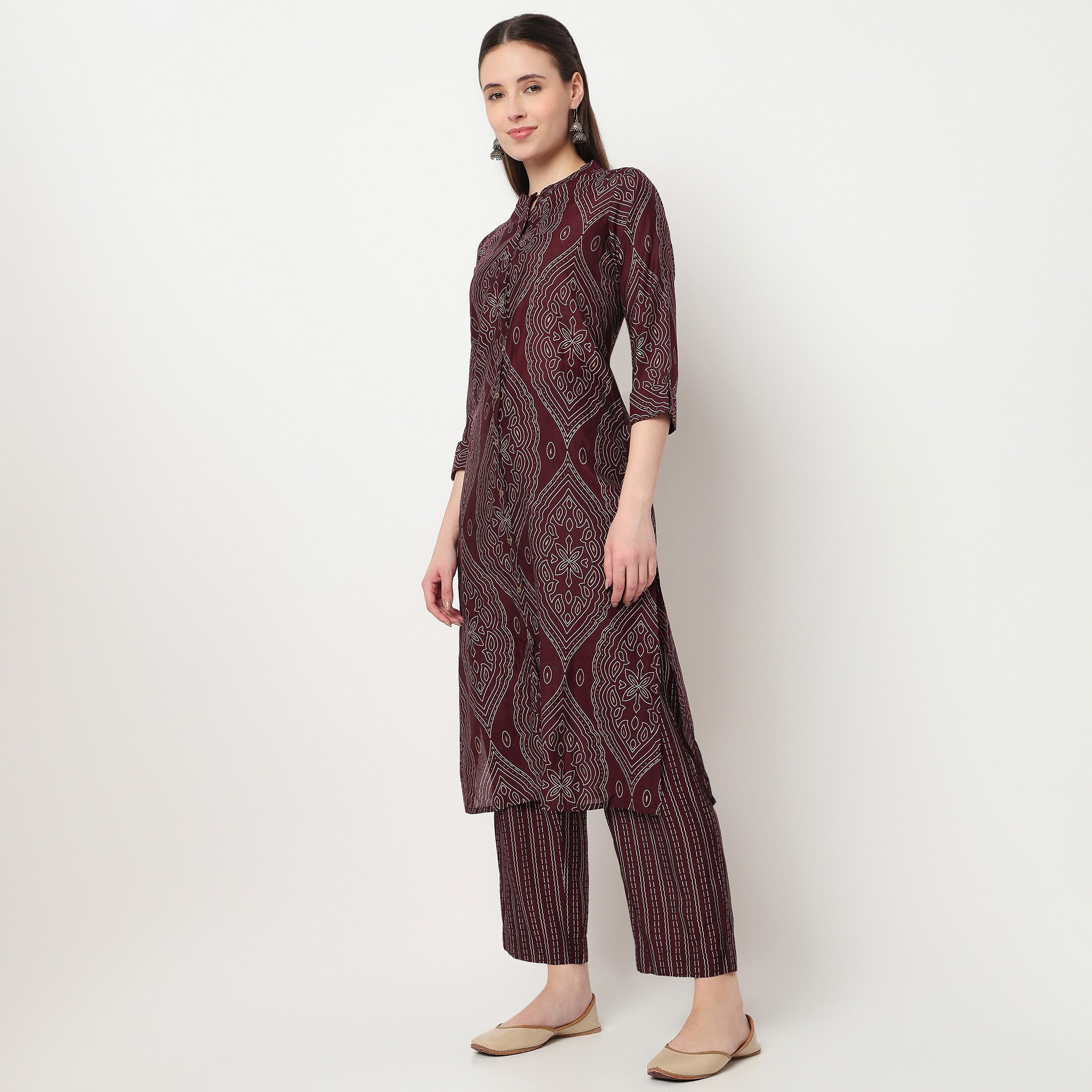 Experience the perfect blend of comfort and style with our Printed Kurta Pant Set. Crafted from 100% Rayon, this set offers a soft, breathable feel that keeps you comfortable all day long. The elegant printed pattern adds a touch of sophistication, making it ideal for both casual outings and festive occasions. The band collar and three-fourth sleeves provide a modern twist to a traditional design, ensuring you stand out effortlessly.