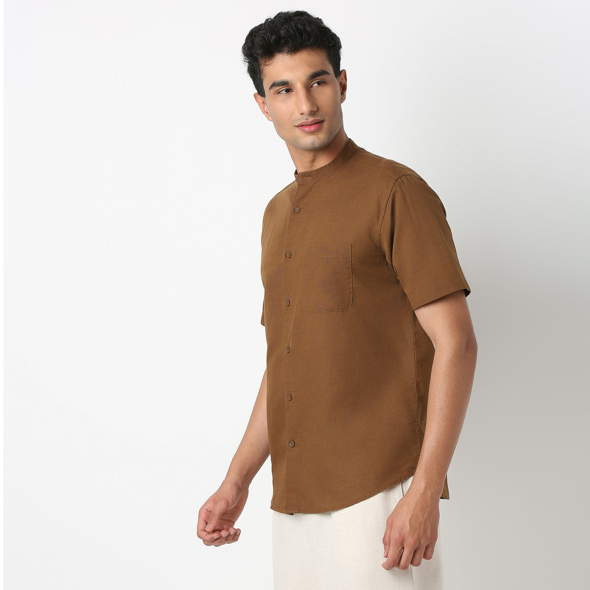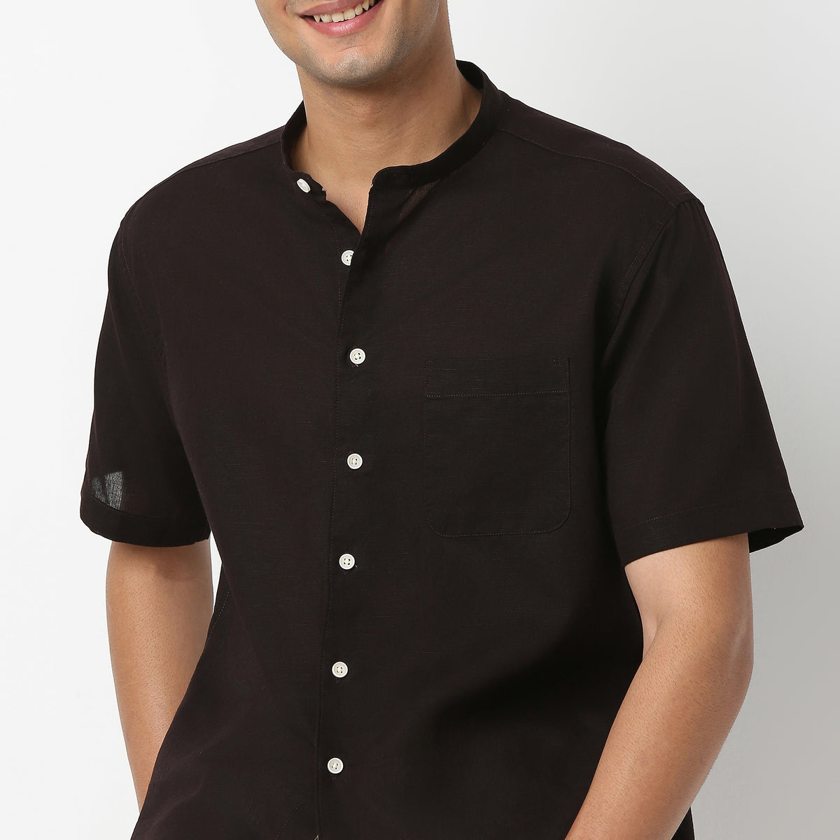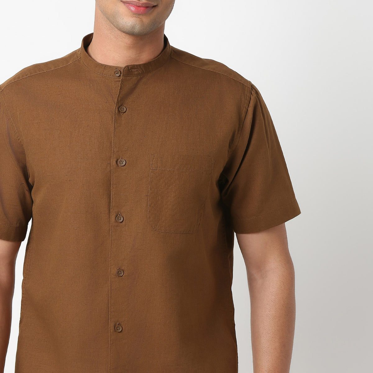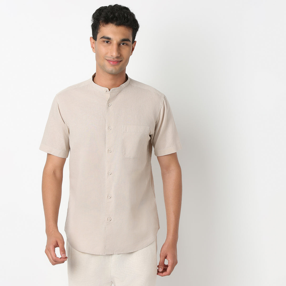 Keep it cool and classic with this Linen Enriched Half Sleeve Casual Shirt, tailored from a fine blend natural fibers of Linen and Cotton for an airy, breathable feel. With a band collar and clean, solid design, this shirt brings effortless sophistication to your everyday style.