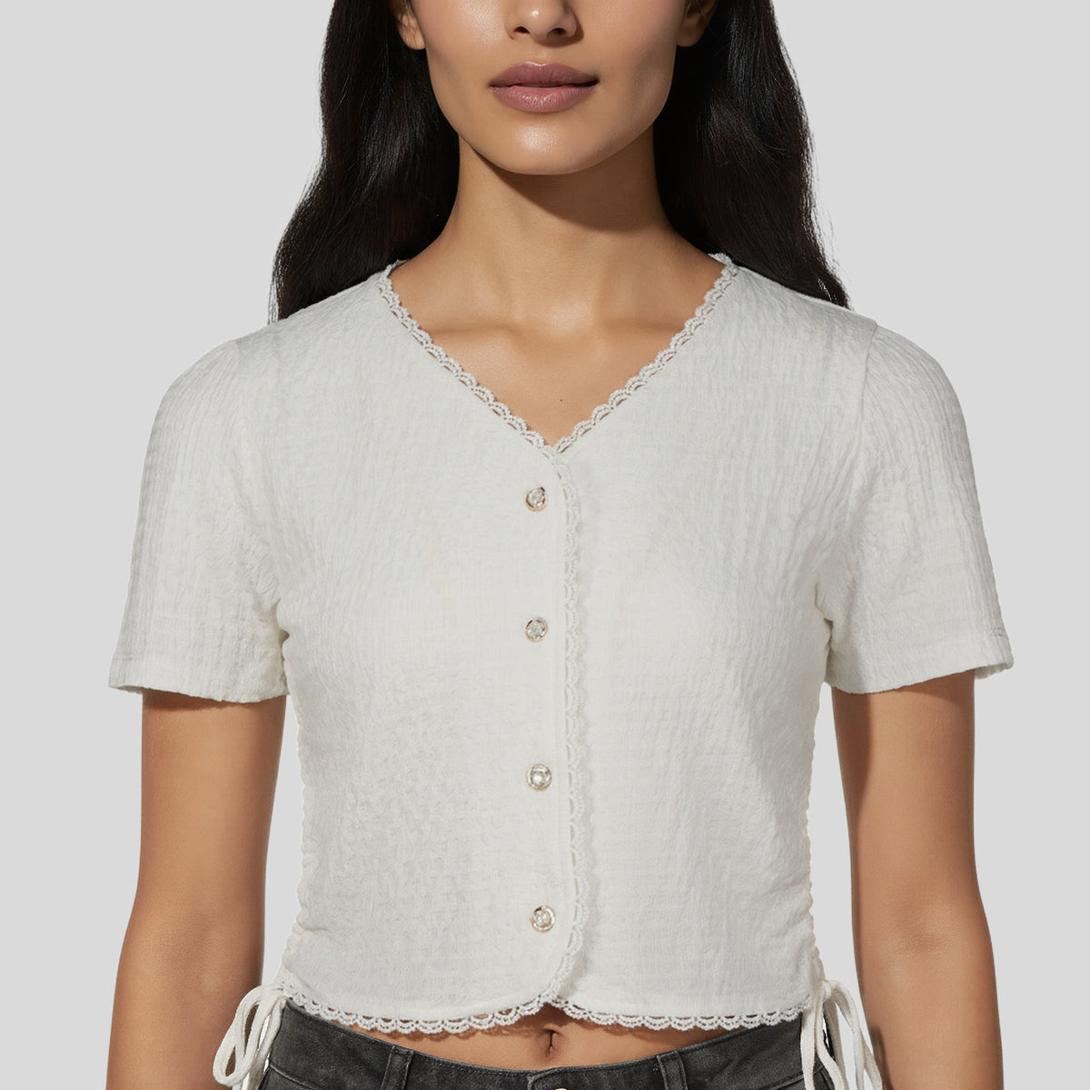 Discover the perfect blend of style and comfort with our V-Neck Structured Top. Crafted from a soft and stretchy polyester-spandex blend, this top offers a modern, stylish, and tailored fit that enhances your silhouette. The structured pattern and side ruching add a touch of sophistication, making it a versatile piece for both casual outings and more formal occasions.