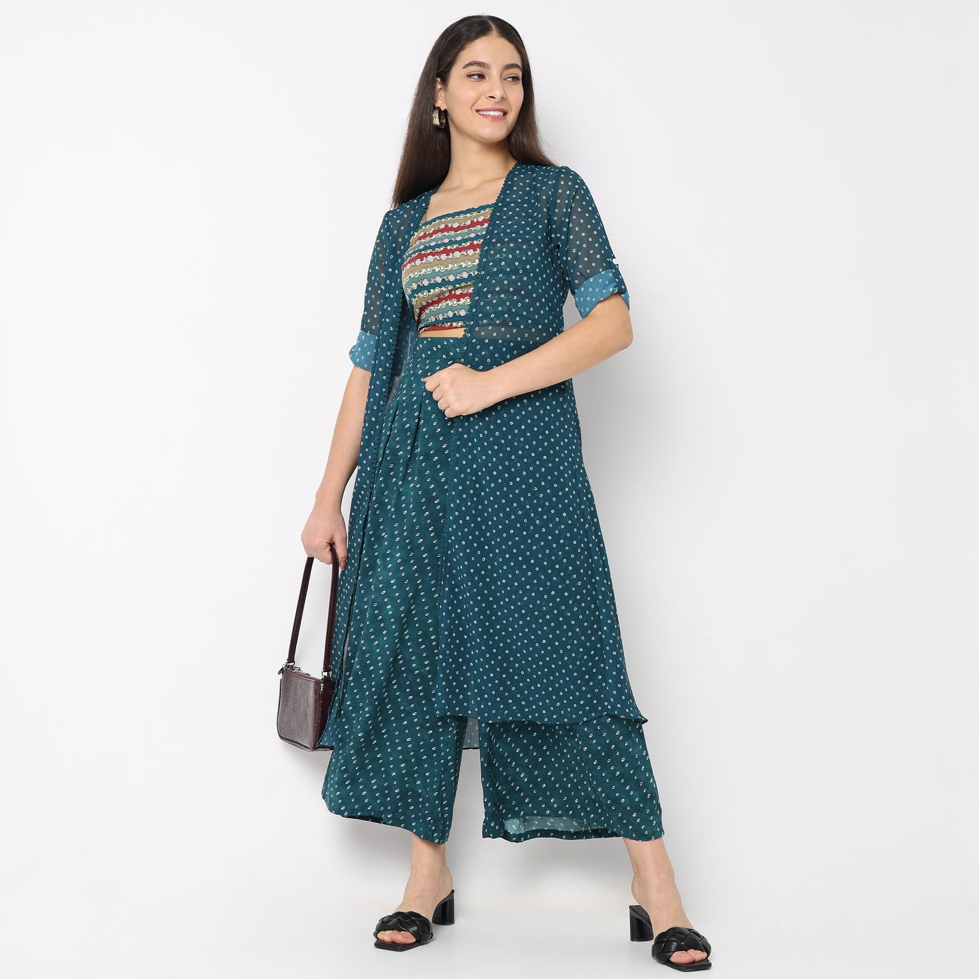 Flare Fit Embellished Top With Palazzo & With Cape Co-Ords