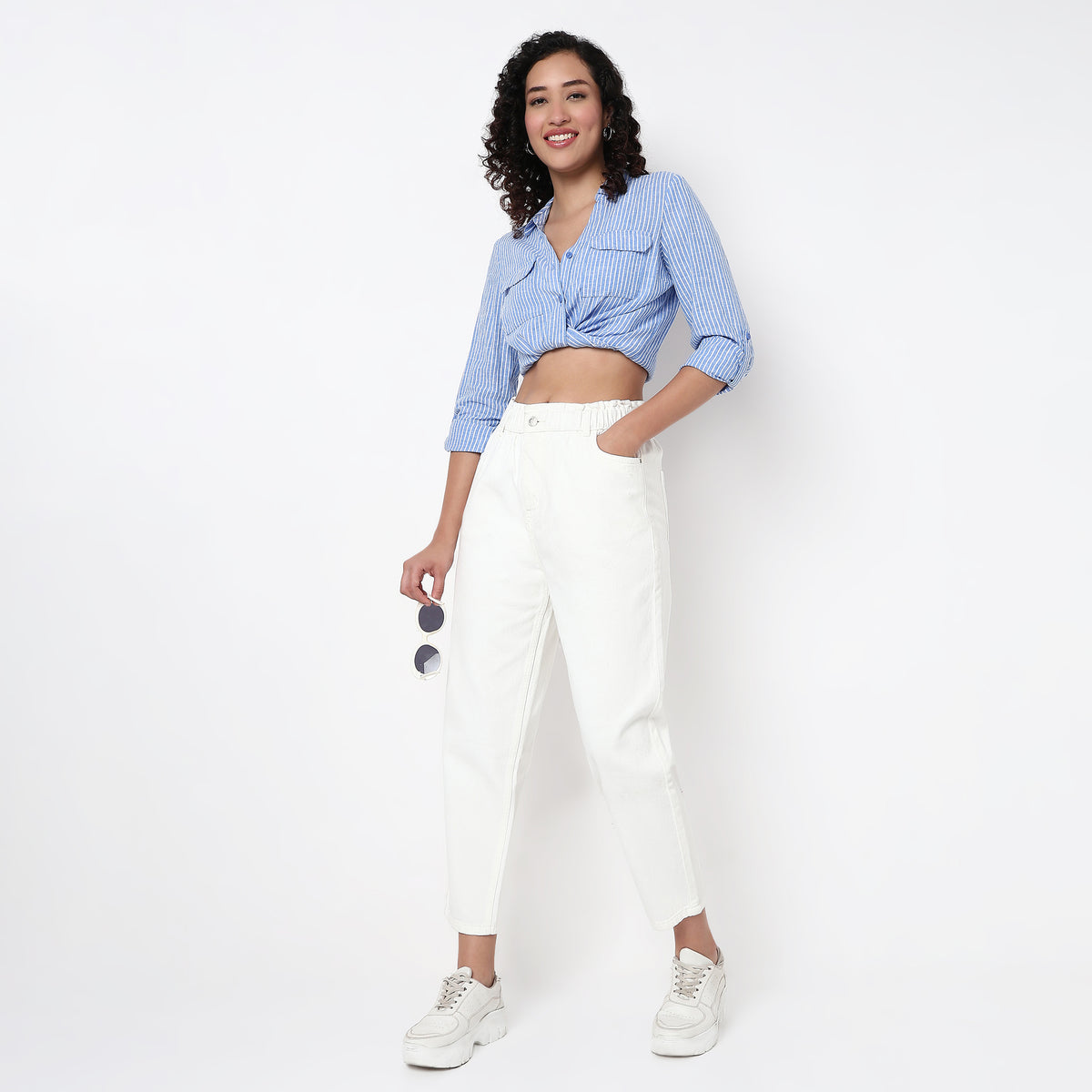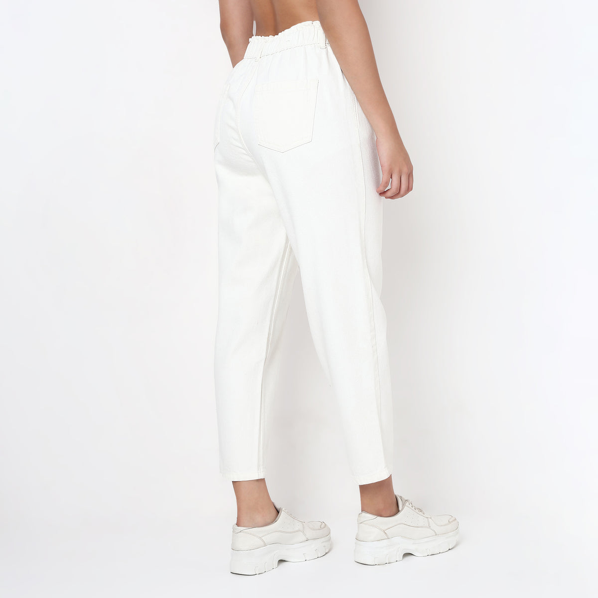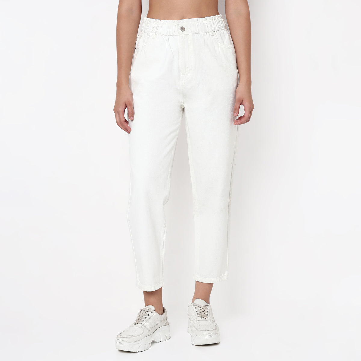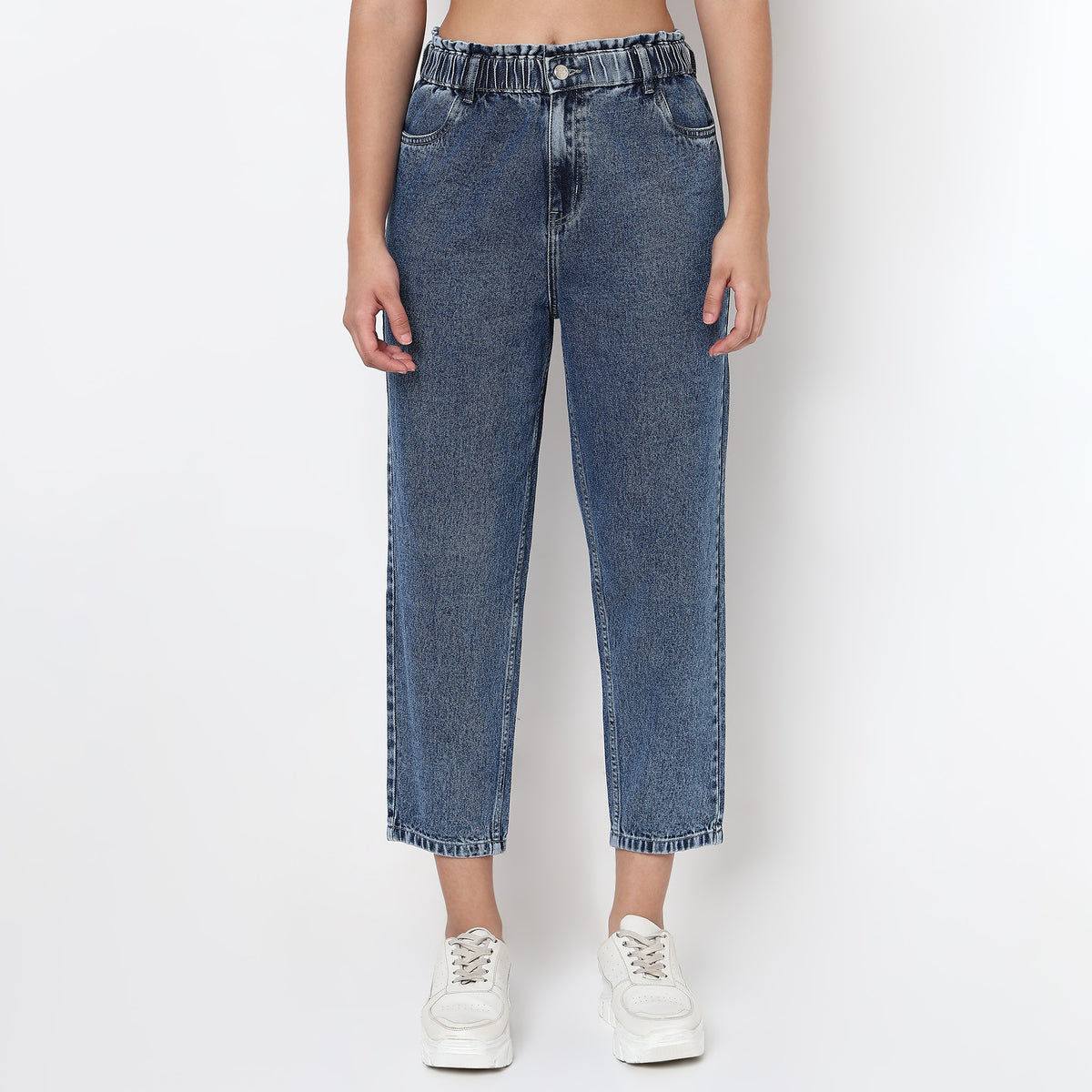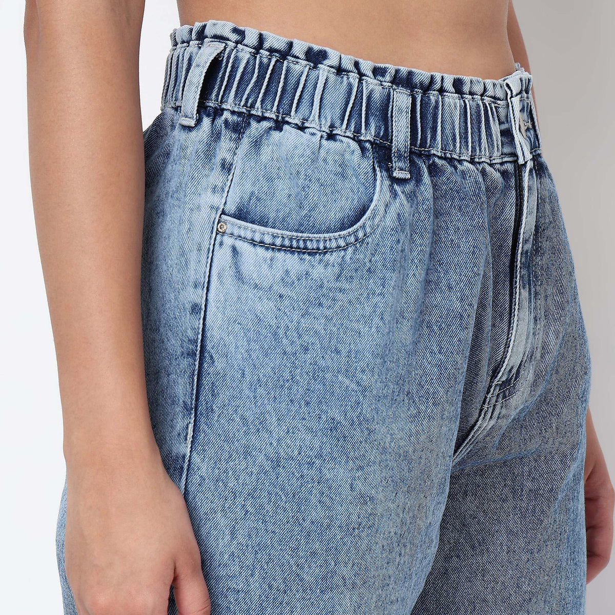 These slouch fit jeans has Cropped length, high rise waist. Made from cotton, it is soft and comfortable to wear.