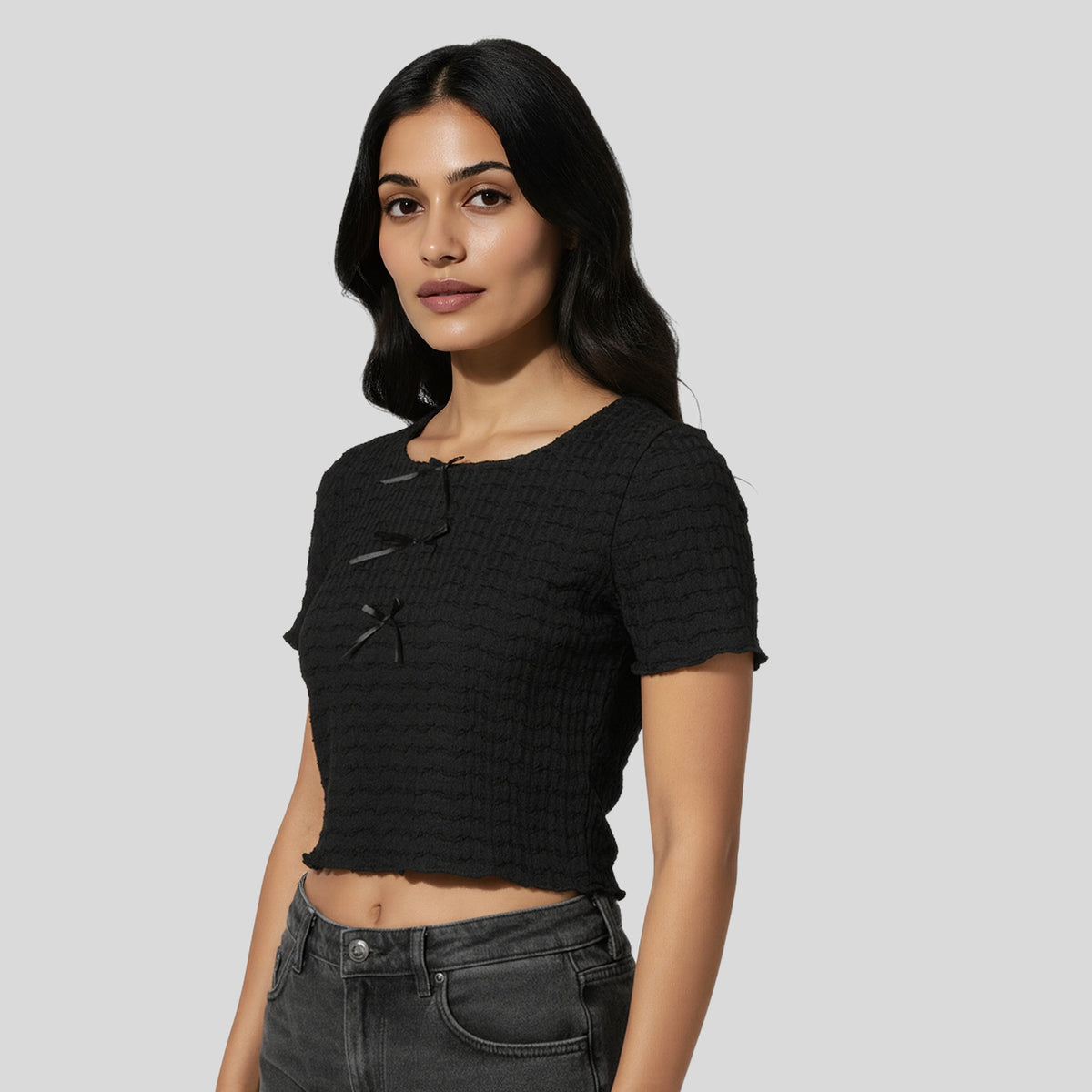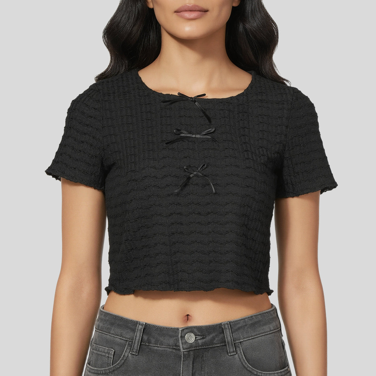 Step into the spotlight with our Structured Crop Top with Bows, a perfect blend of modern style and playful elegance. Crafted from a soft and stretchy polyester-spandex blend, this top offers a snug, tailored fit that accentuates your silhouette while ensuring all-day comfort. The structured design adds a touch of sophistication, making it a versatile piece for both casual outings and chic evening events.