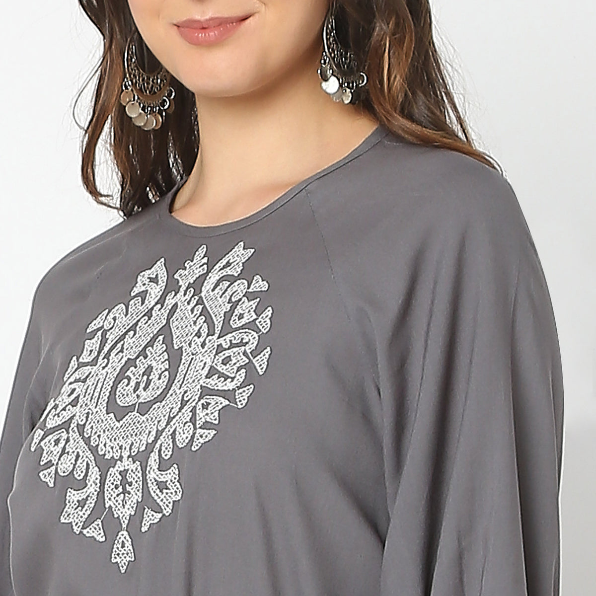 This embroidered pattern Dress has a round neck and three-fourth sleeve. Made from rayon, it is soft and comfortable to wear.