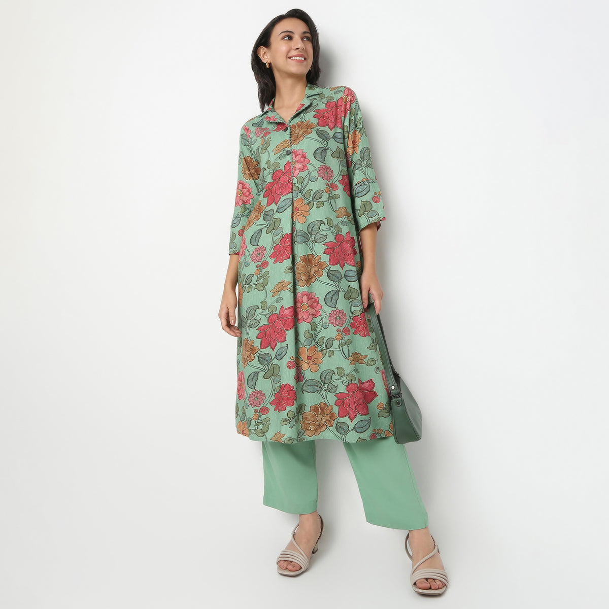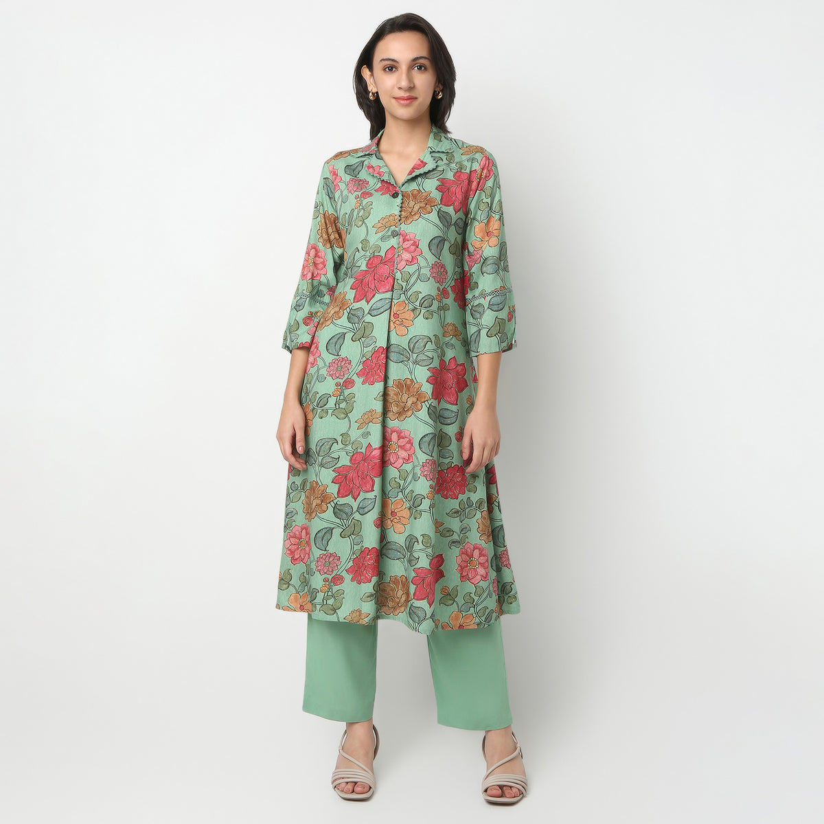 Printed Below Knee Camp Collar A-Line Flared Kurta With Pant Set