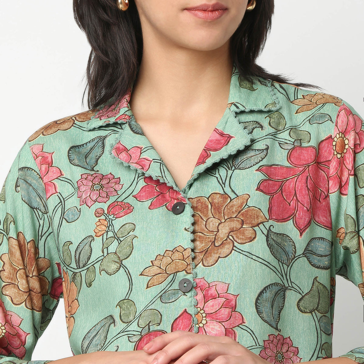 Elevate your ethnic wardrobe with the Printed Below Knee Camp Collar A-Line Flared Kurta with Pant Set. Crafted from 100% rayon, this kurta set is soft, breathable, and perfect for all-day wear. The A-line flared silhouette, camp collar, and Cultural Kalamkari print add a touch of elegance, making it an ideal choice for festive gatherings, casual outings, or workwear.