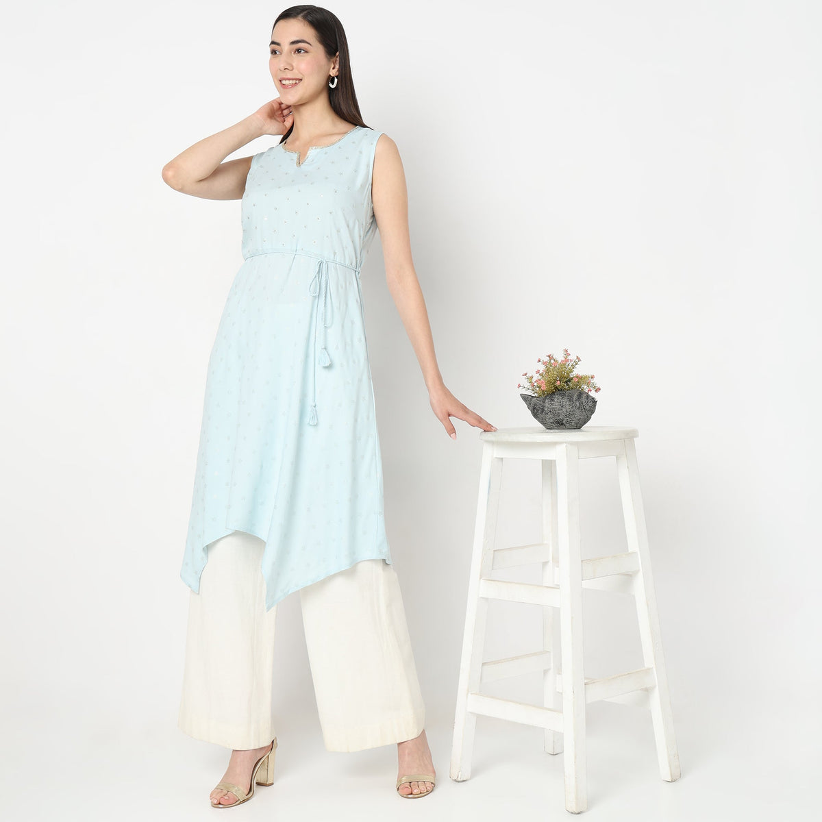 Fabric type: ViscoseWeave type: WovenPattern: EmbellishedLength: Knee LengthNeck Type/ Collar: Round NeckCut Shape: A LineTheme: Sorbet SymphonyStyle: KurtaSleeve Type: SleevelessFit Type: Regular Fit