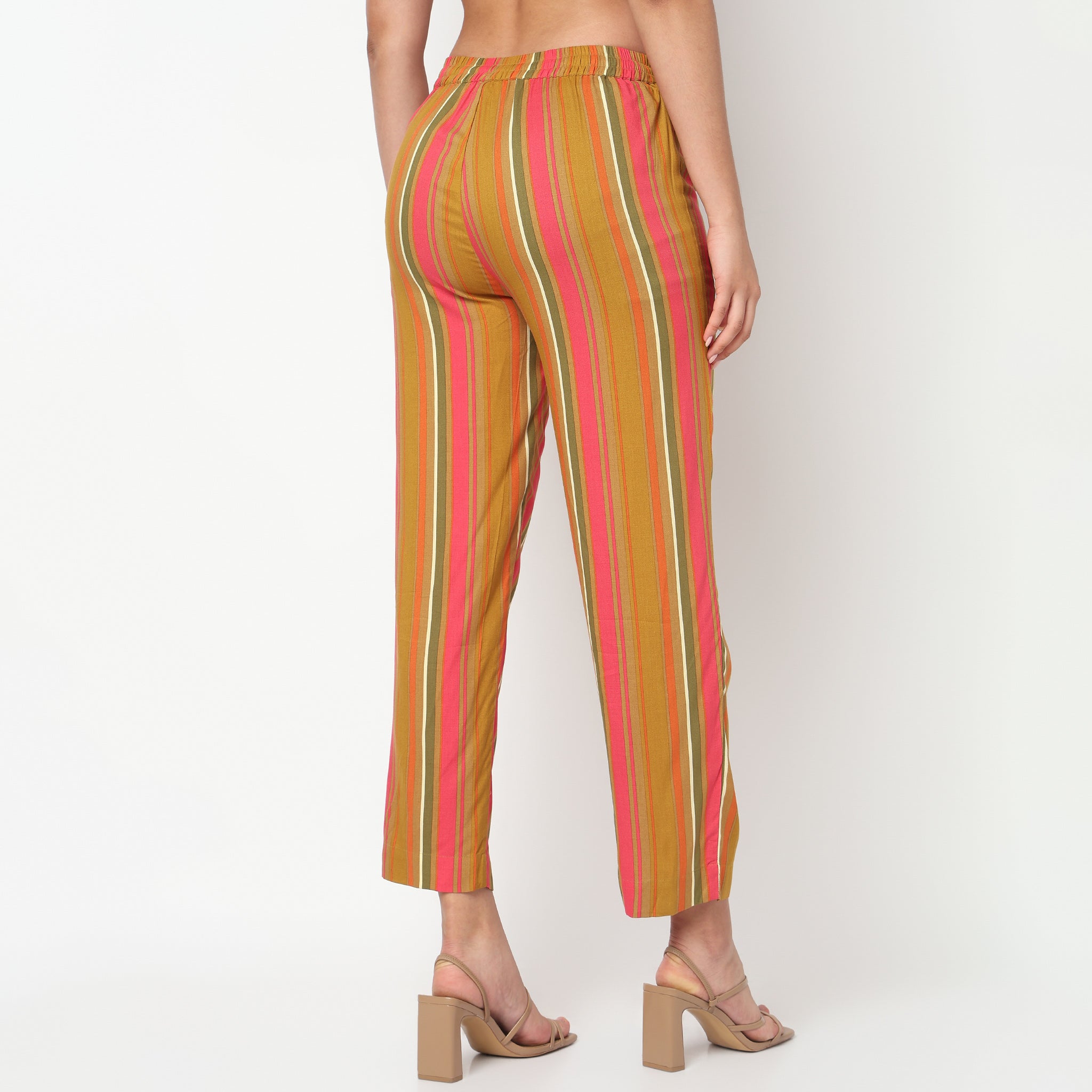 Introducing the Striped Mid Rise Cord-It Pant, designed for women who appreciate comfort and style. Crafted from soft rayon, these ankle-length pants feature a chic striped pattern, perfect for any occasion.