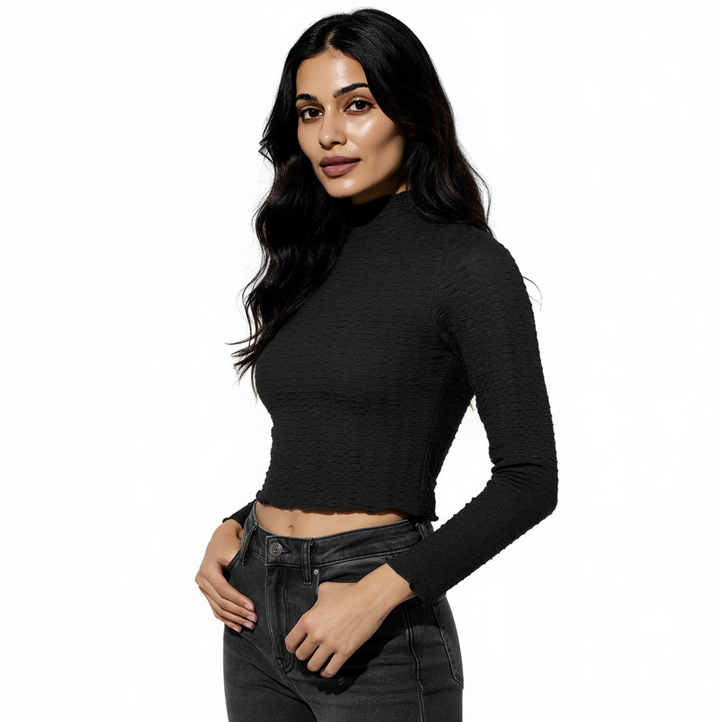 Experience the perfect blend of style and comfort with our Mock Neck Structured Crop Top. Crafted from a soft and stretchy polyester-spandex blend, this top offers a modern, stylish, and tailored fit that enhances your silhouette. The structured pattern adds a touch of sophistication, making it a versatile piece for any wardrobe. Whether you're heading to a casual outing or a night out, this crop top is your go-to choice for effortless elegance.