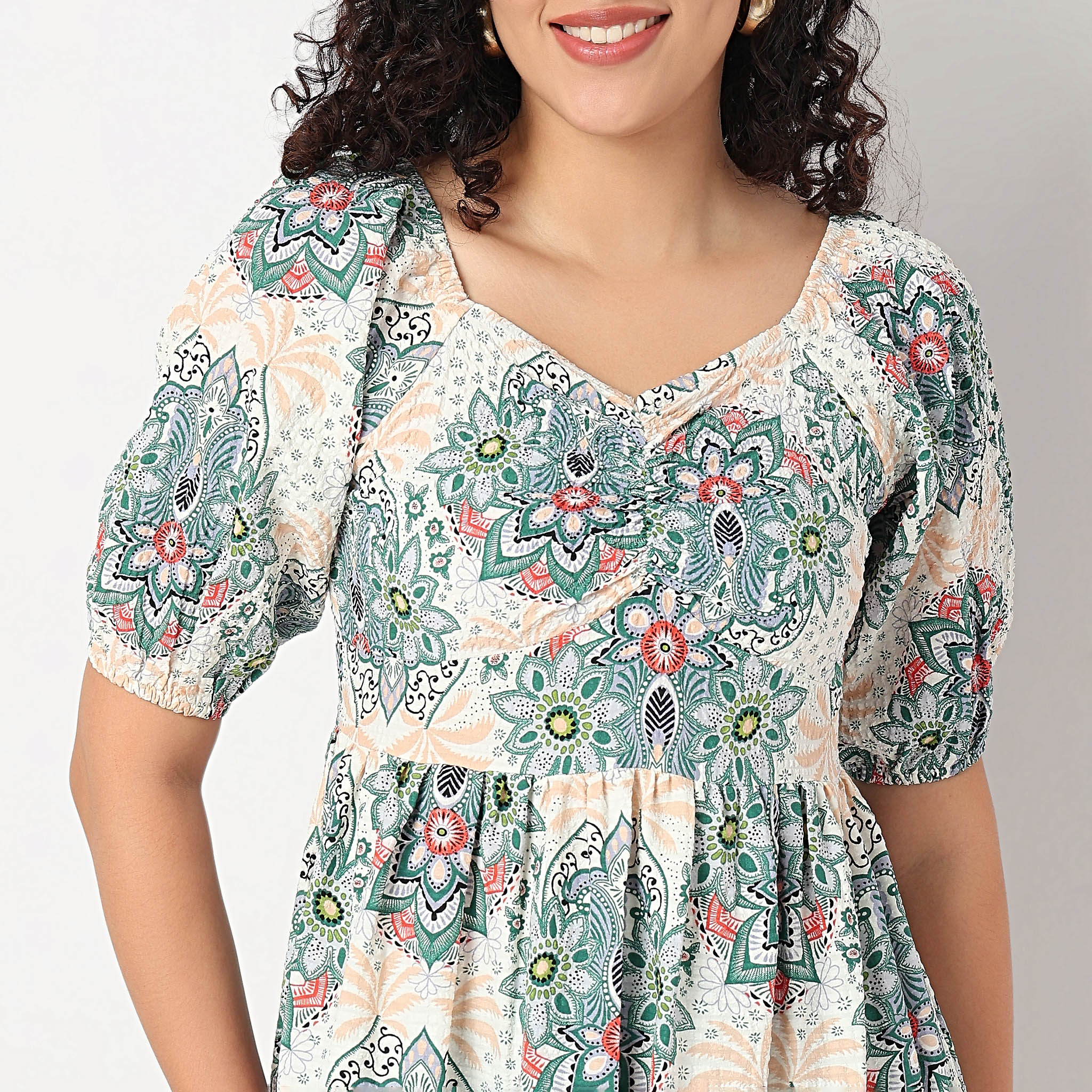 Step into effortless elegance with our Printed Tiered Knee-Length Dress. Crafted from 100% polyester, this dress offers a lightweight and breathable feel, perfect for any occasion. The woven fabric ensures durability, while the flared fit provides a flattering silhouette that moves with you. The sweetheart neck adds a touch of romance, making it ideal for both day and night events.