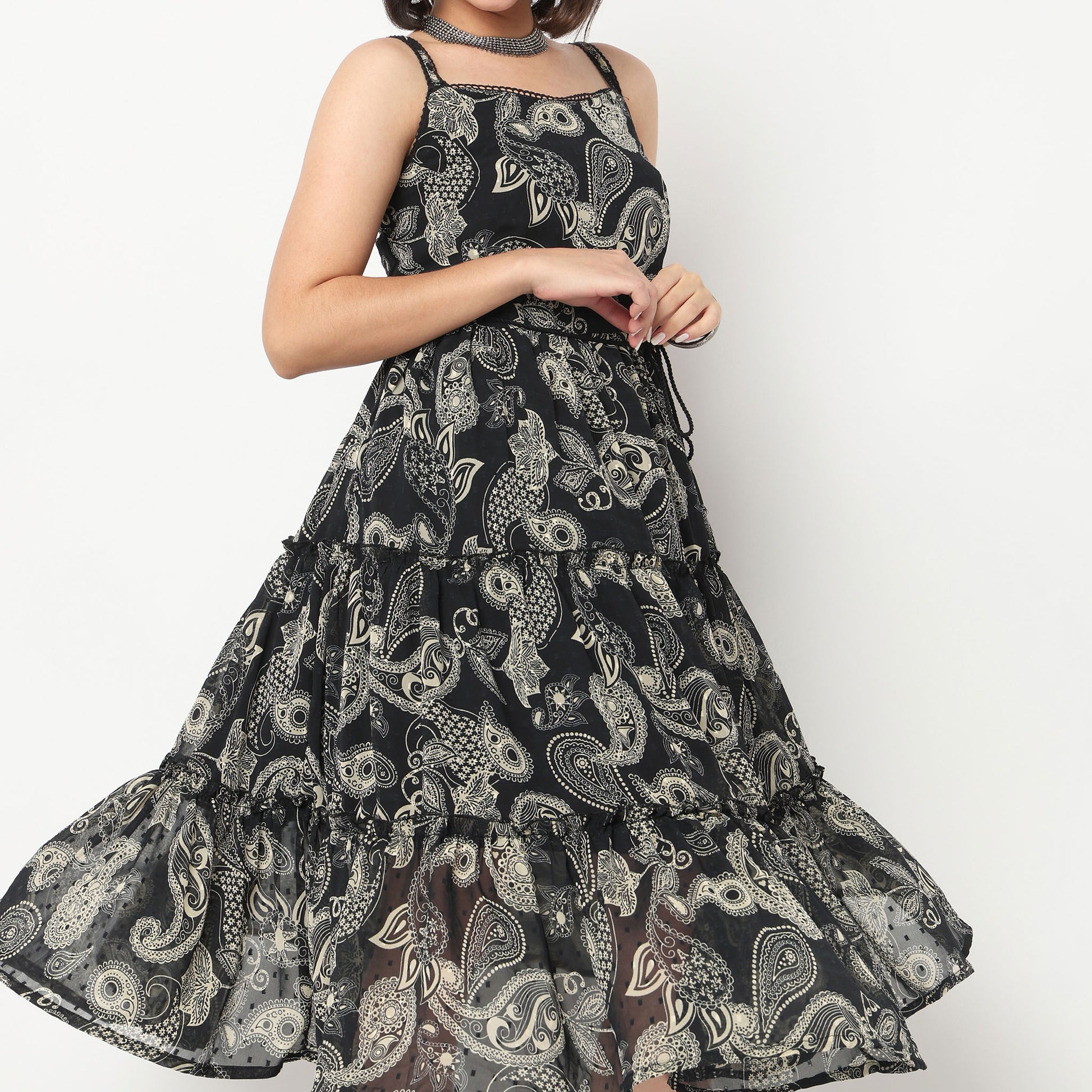 Elevate your wardrobe with our Printed Knee Length Tiered Dress, designed specifically for women who appreciate style and comfort. Crafted from soft woven polyester, this dress features a beautiful printed pattern that adds a touch of elegance to any occasion.