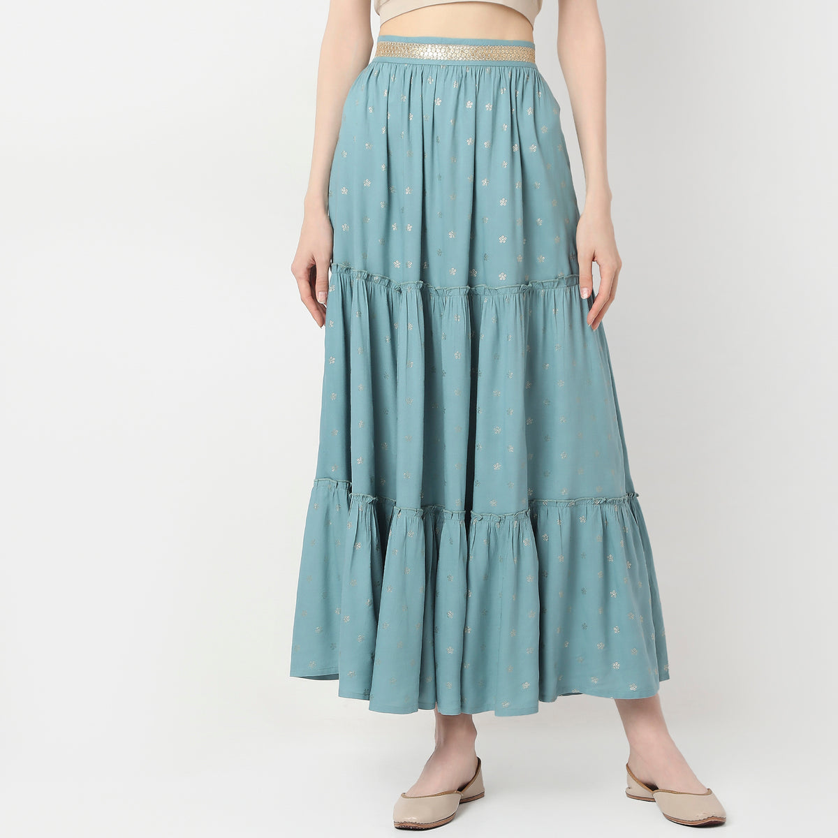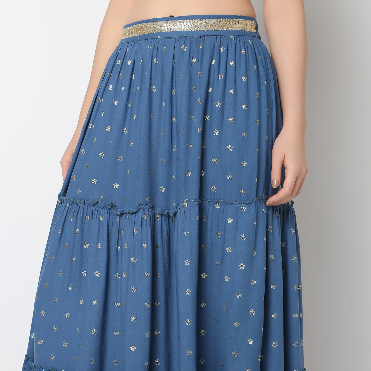 These printed pattern flare fit skirts has ankle length, high rise waist. Made from rayon, it is soft and comfortable to wear.