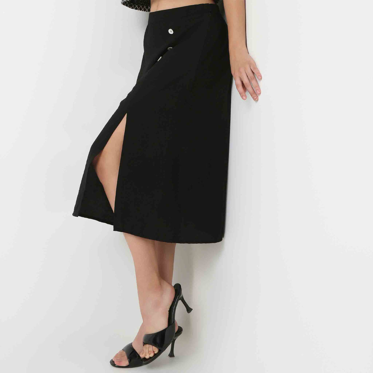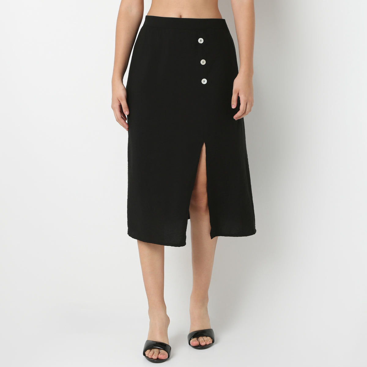 Experience the perfect blend of elegance and comfort with our Straight Fit High Rise Slit Skirt. Crafted from a luxurious blend of polyester and lycra, this skirt offers a soft touch and a flattering silhouette that complements any body shape. The high-rise design accentuates your waist, providing a sleek and sophisticated look that transitions effortlessly from day to night.