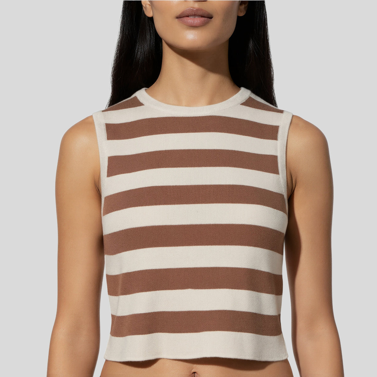 Embrace the modern elegance of our Sleeveless Striped Flat Knit Sweater, crafted for the fashion-forward woman who values both style and comfort. This slim fit sweater is designed to hug your silhouette, offering a chic and tailored look that is perfect for any occasion. The striped pattern adds a touch of timeless sophistication, while the cropped length makes it ideal for pairing with high-waisted jeans or skirts. Whether you're heading to a casual brunch or a night out, this versatile piece will keep you looking effortlessly stylish.