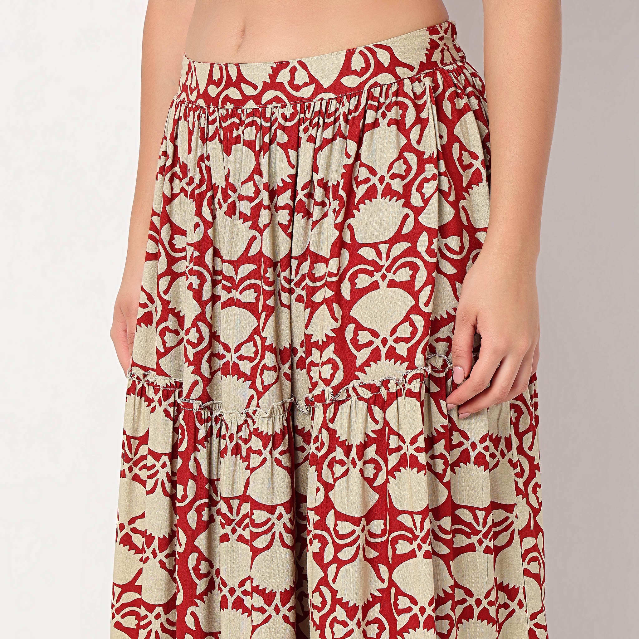 Experience the perfect blend of comfort and style with our Printed Flared High Rise Skirt. Crafted from 100% Rayon, this skirt offers a soft, breathable feel that keeps you comfortable all day long. The vibrant printed pattern adds a touch of elegance and flair, making it a versatile addition to your wardrobe. Whether you're heading to a casual brunch or a day at the office, this skirt is your go-to choice for effortless chic.
