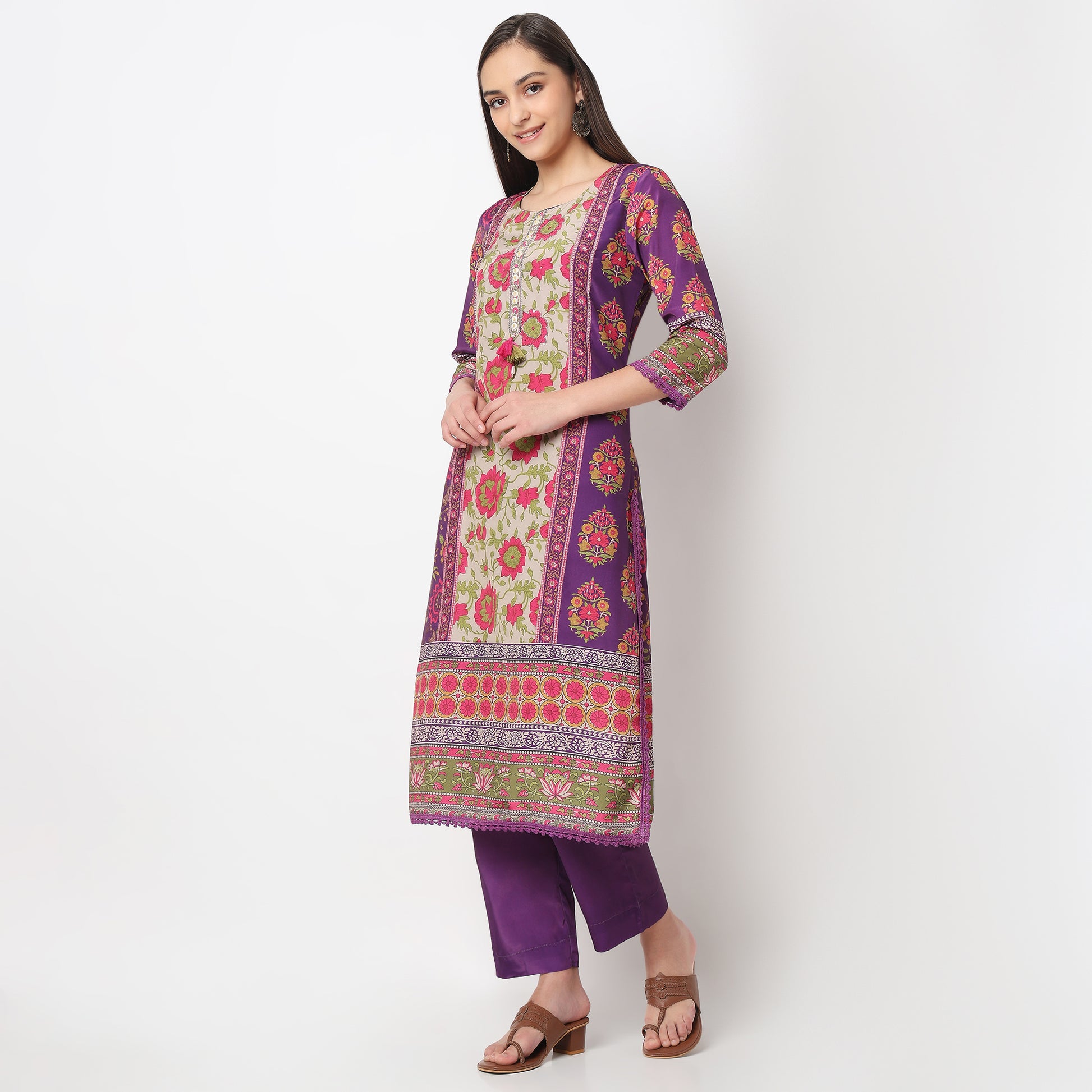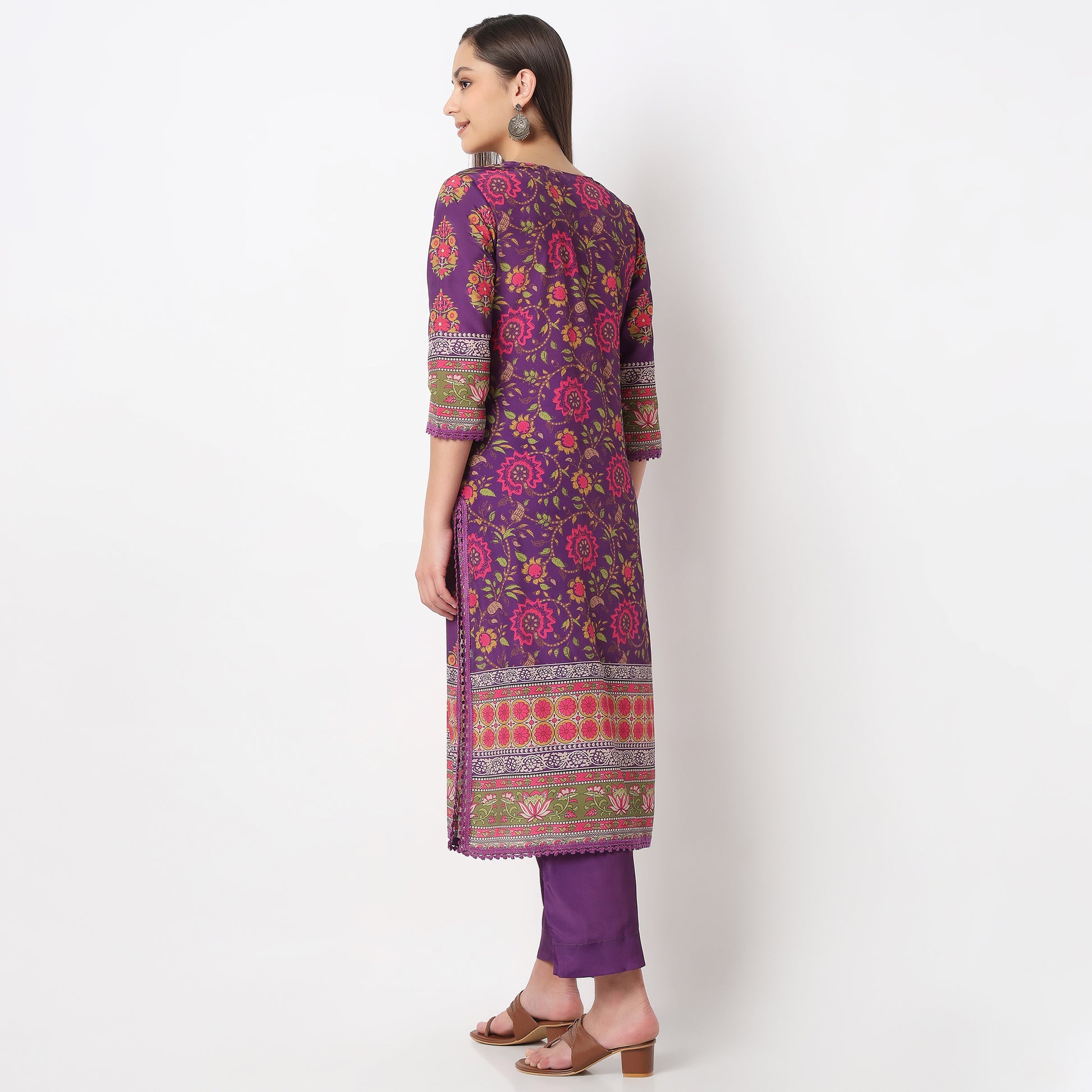 Elevate your wardrobe with the Printed Straight Kurta with Pant Set, crafted from high-quality Rayon for ultimate comfort. The woven fabric and vibrant printed pattern offer a chic and stylish appeal, while the straight fit ensures a flattering silhouette that suits various body types. Perfect for casual outings or festive occasions, this ensemble can easily be paired with stylish sandals or statement accessories.