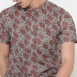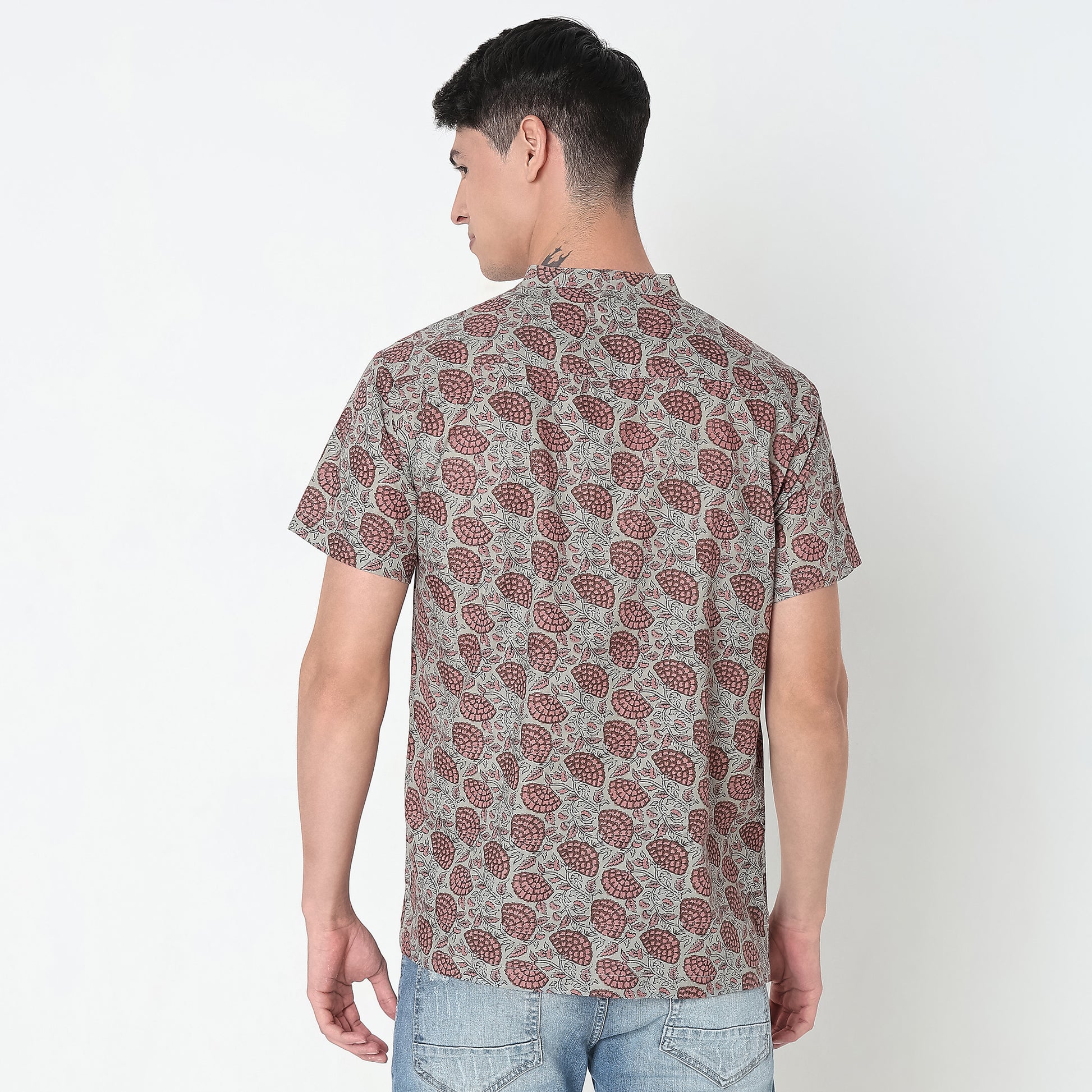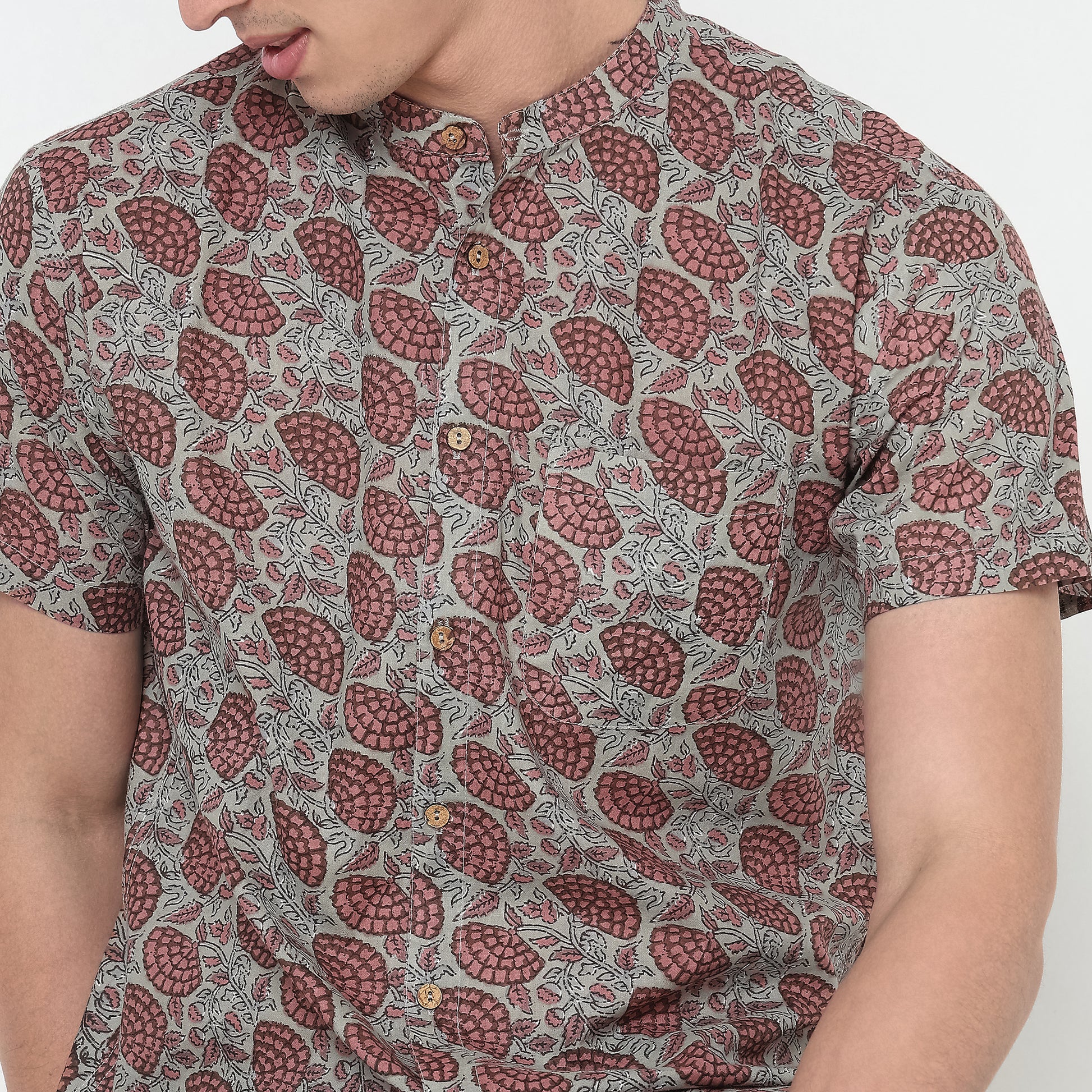 This printed pattern shirt has a mandarin collar and half sleeve. Made from cotton, it is soft and comfortable to wear.